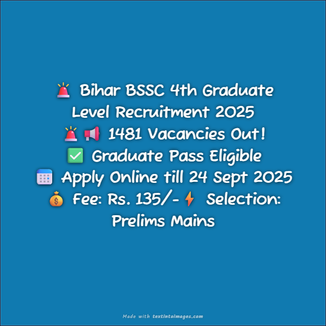 Bihar Staff Selection Commission (BSSC) has officially announced the BSSC 4th Graduate Level Recruitment 2025 for a total of 1481 vacancies. The online application process will begin from 25 August 2025 (postponed) and will remain open till 24 September 2025. Candidates who are graduates in the required disciplines can apply through the official website of BSSC or directly via the important links provided below.